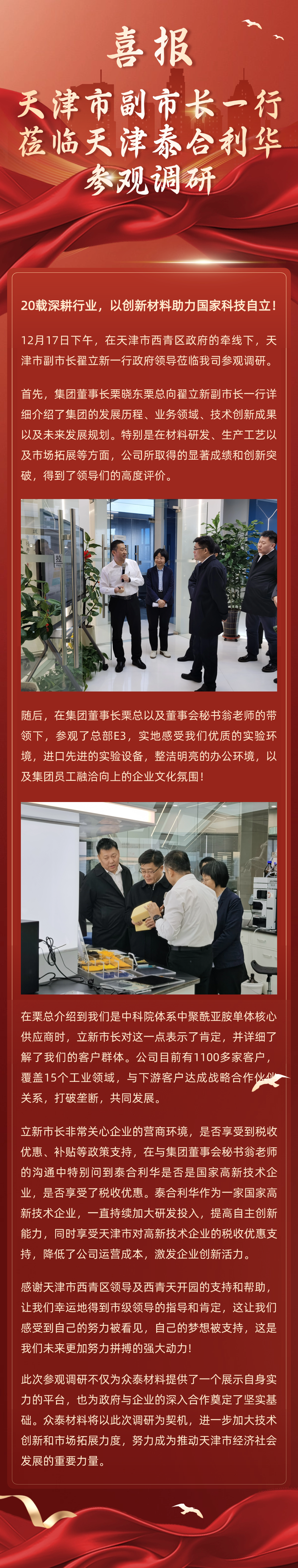 12月17日下午,在天津市西青區(qū)政府的牽線下,天津市副市長翟立新一行政府領(lǐng)導蒞臨我司參觀調(diào)研。